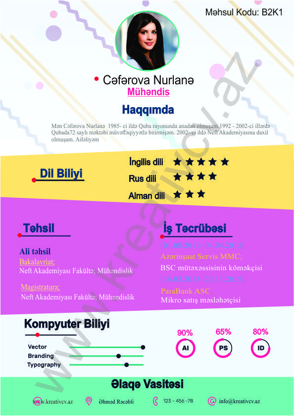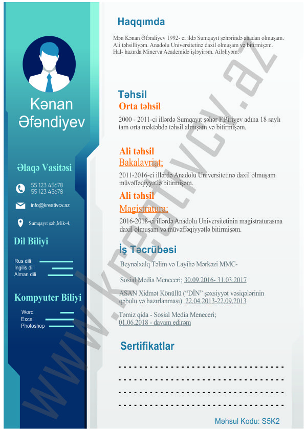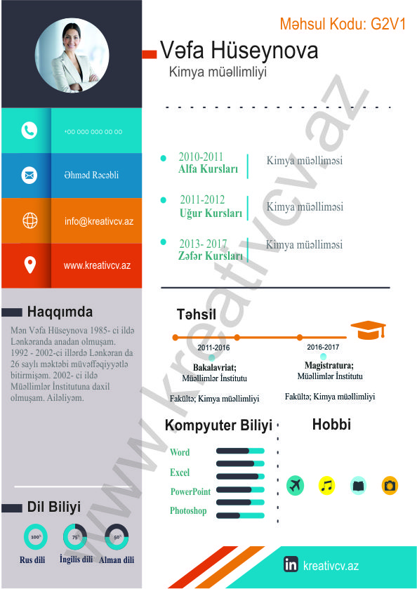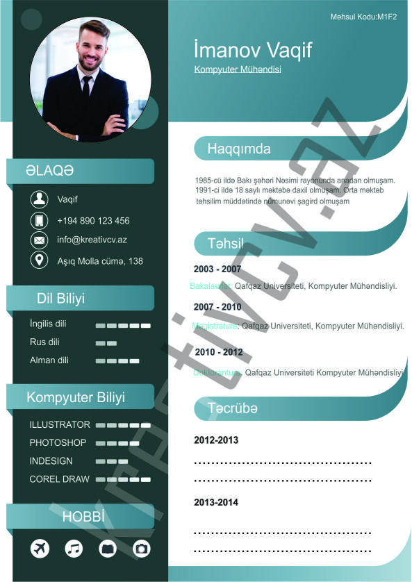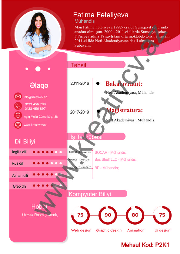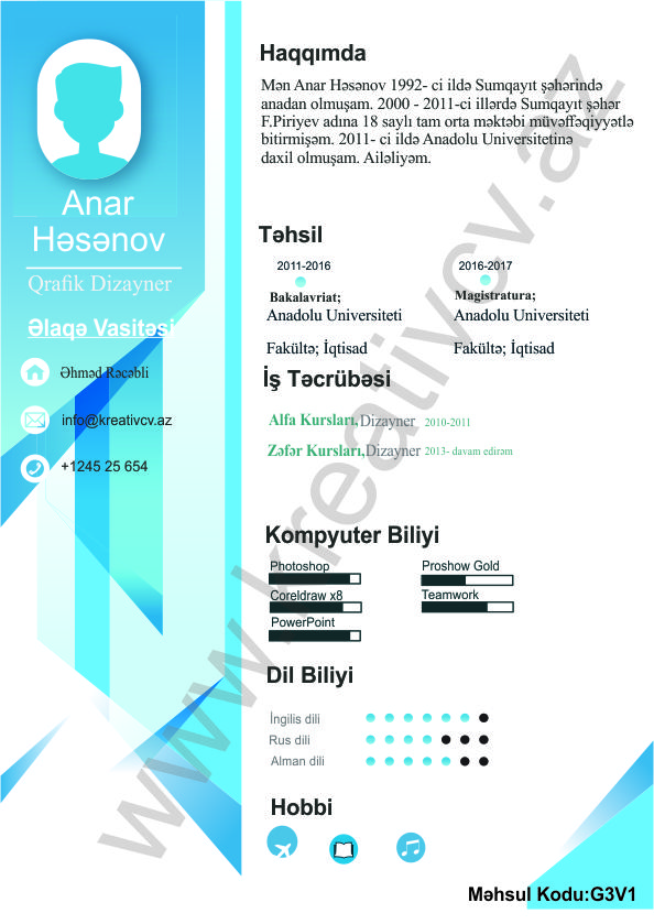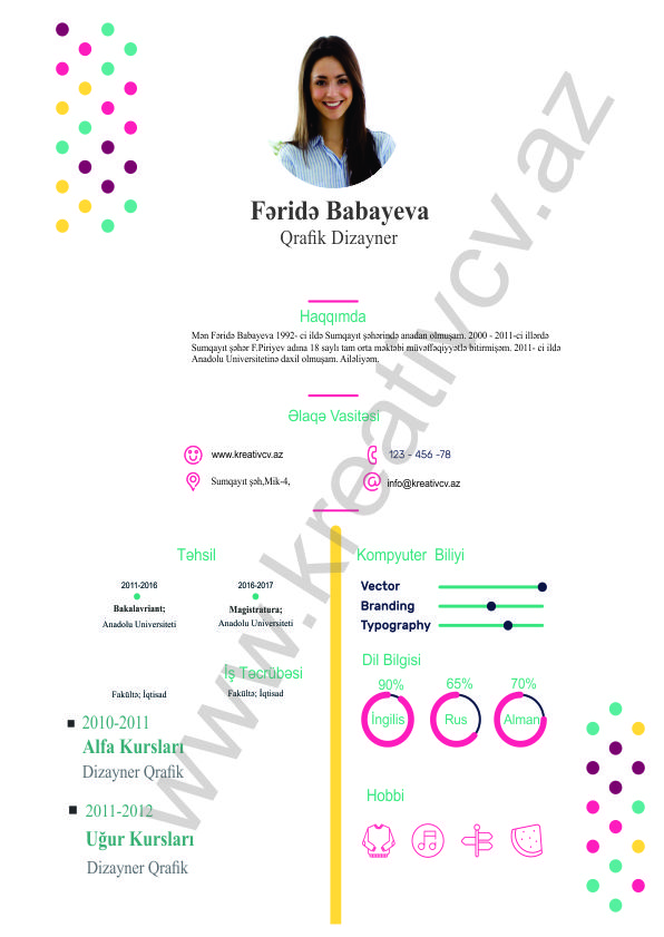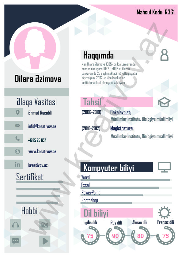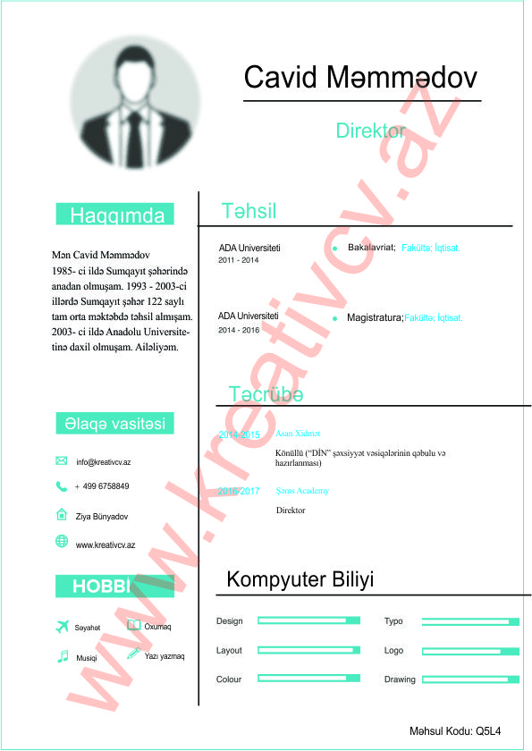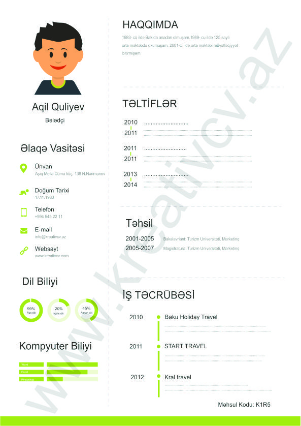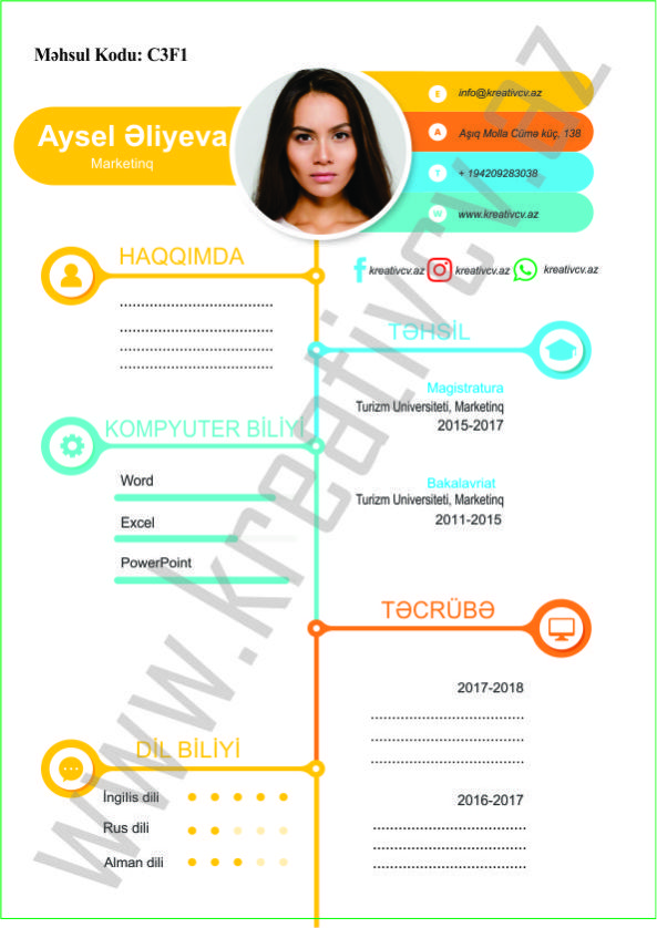 Müraciət etdiyiniz iş yerlərindən cavab əldə edə bilməməyin başlıca səbəblərindən biri, Sadə və Şablon CV-lərlə diqqət çəkə bilməməkdir. Belə olan halda, diqqət çəkməyin mümkün olmadığını nəzərə alaraq kreativcv.az sizə Azərbaycanda ilk dəfə, tam yeni növ CV-ləri təqdim edir. Bizə müraciət etməklə, CV-nizin görüntüsünü daha cazibədar edin.